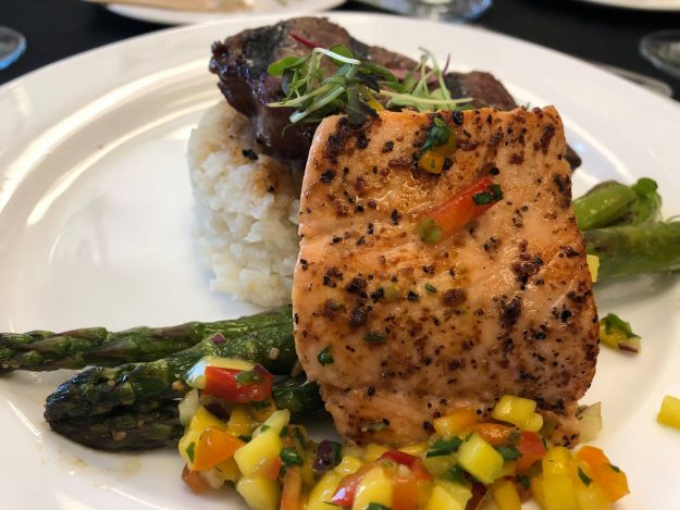 Sautéed Garlic Asparagus, Coconut Milk Rice, and Teriyaki Marinated and Grilled Petite Filet Mignon with Salmon in a Spicy Mango Pico Salsa